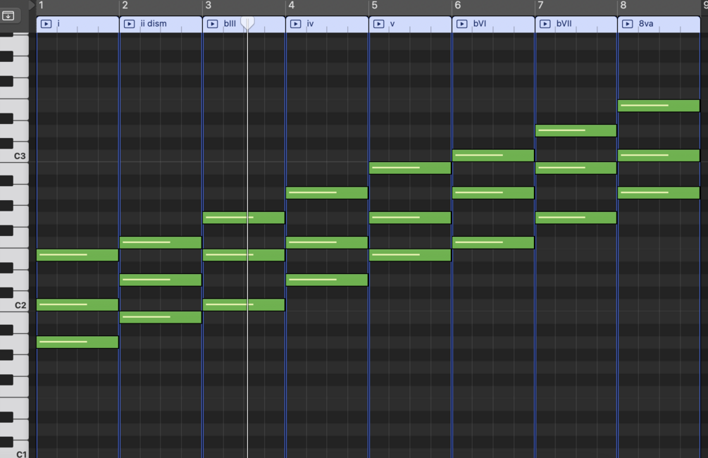 Obtendrás todos los acordes de Do Mayor y La menor con sus grados etiquetados.